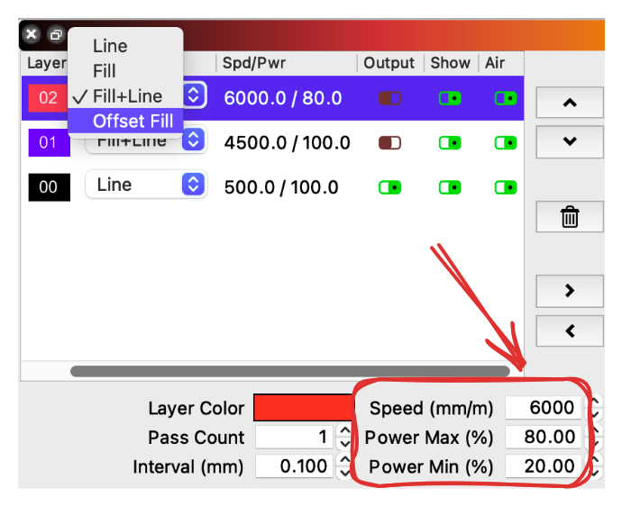 200 mm/min (100%) 2 passes2000 mm/min (50%) |